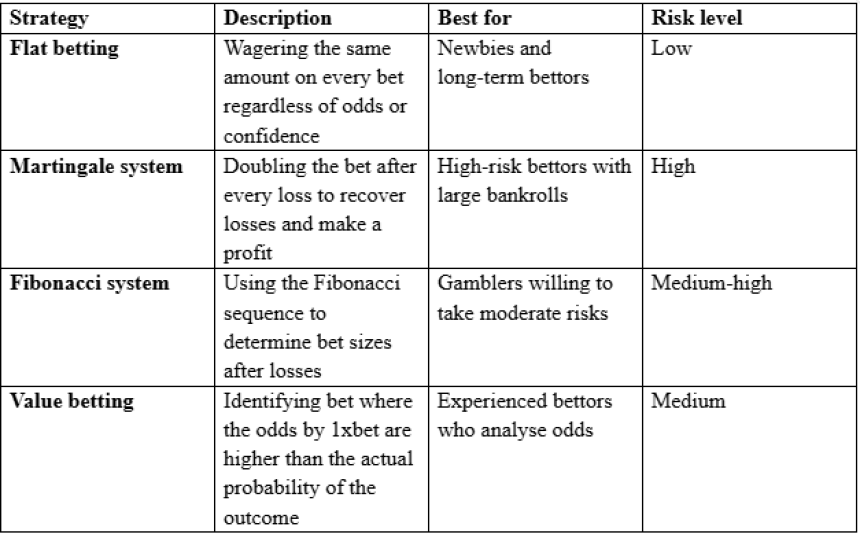 Whether you are a new or seasoned bettor, you need to develop a betting strategy that aligns with your goals and playing style. You can opt for a strategy that involves betting on favourites, underdogs, totals, etc. The table below highlights some of the popular betting strategies you can use.