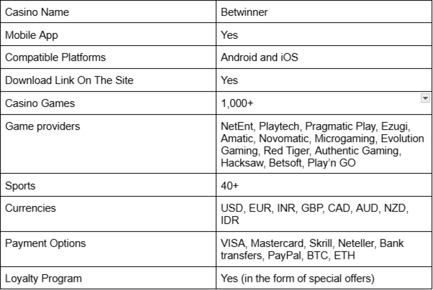 For starters, it’s enough to say that it has an official Curacao gaming license, as well as more than 40 sports you can bet on. While we’ll focus on every aspect of the site later through our Betwinner casino review, you can check some key details in the table below