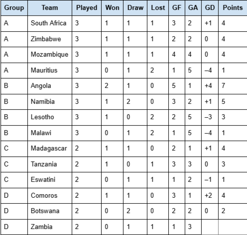 Group A, South Africa, Zimbabwe, Mozambique, and Mauritius, were all tied at four or three points. As each team competes for the goal difference advantage, a thrilling final-round match is anticipated.